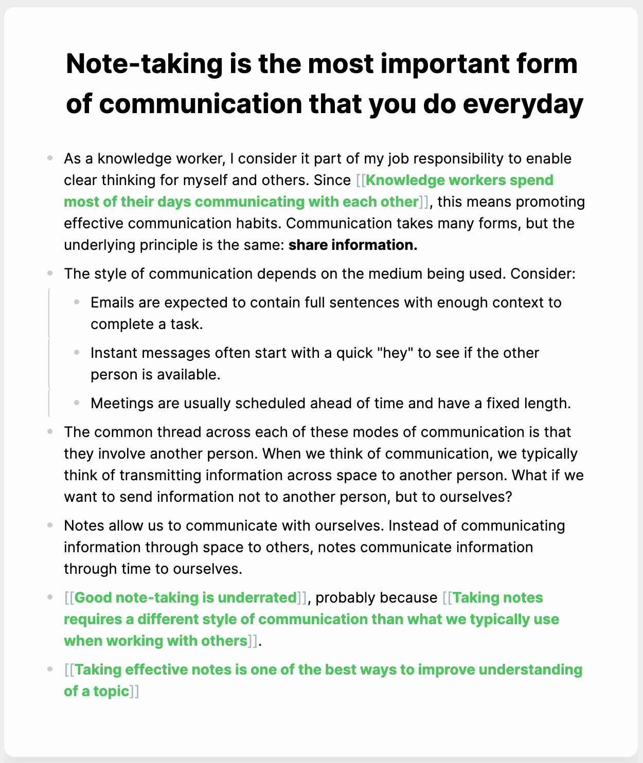 Inside of the note are links to related evergreen notes. Related notes are designated with [[double brackets]] and green links. Clicking on any of those links will take you to a short evergreen note where I provide more context and examples of the idea.